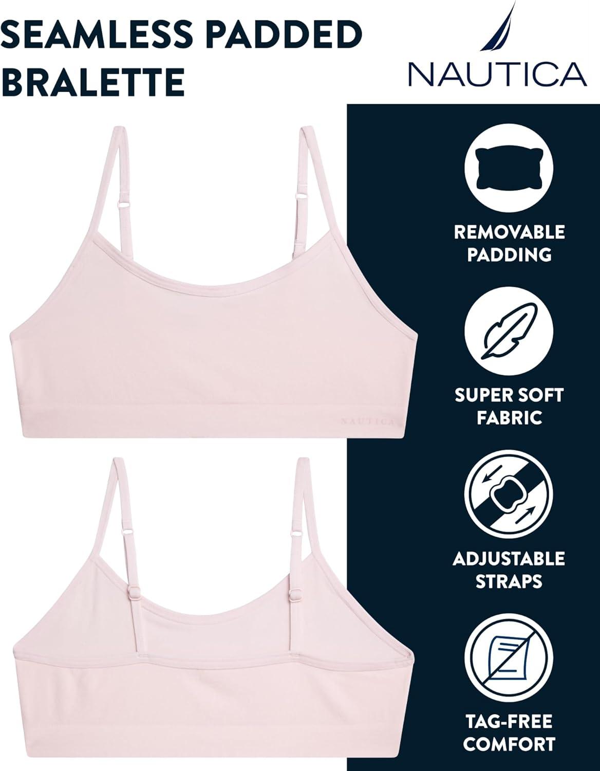 Support meets softness in the Nautica Girls Training Bra – 2 Pack/4 Pack Seamless Padded Bralette Underwear for Girls with Removable Pads (Sizes: S-XL), a starter essential built for comfort, confidence, and everyday wear. Designed for growing girls, each cami bralette features a smooth, seamless body and breathable construction, giving her freedom to move through her day. Whether layered under uniforms or worn with casual girls clothes, these padded bralettes deliver light support with removable pads for modesty and shaping that grows with her. Made for every stage of her journey, this bras pack includes versatile colors and a tag-free interior to keep irritation at bay. Adjustable straps and a stretch-fit band offer security without sacrificing comfort, making it a go-to style for training bras for girls, school days, sports, and everything in between. The ribbed underband provides stay-put support, and the seamless design keeps lines hidden beneath even a white cami or fitted tee. Perfect for transitioning from a girl bra to more supportive styles, these soft bras are a top pick among tween bras and everyday girls’ training bras collections. Whether she needs a sports bra for girls for gym class or a bralette with padding for extra coverage, this set checks every box. It's more than just girls underwear, it's a reliable foundation for growing up. From tween girl clothes to first teen girl underwear, this multi-pack supports every phase, ideal as girl training underwear, a padded cami, or a lightweight youth sports bra. Give her wardrobe a breathable, stretch-ready upgrade with kids bras built for movement and made to last. Great for those in search of sports bras for teens, underwear for teen girls, or a comfy starter bra for teens, this is the confidence she can wear.