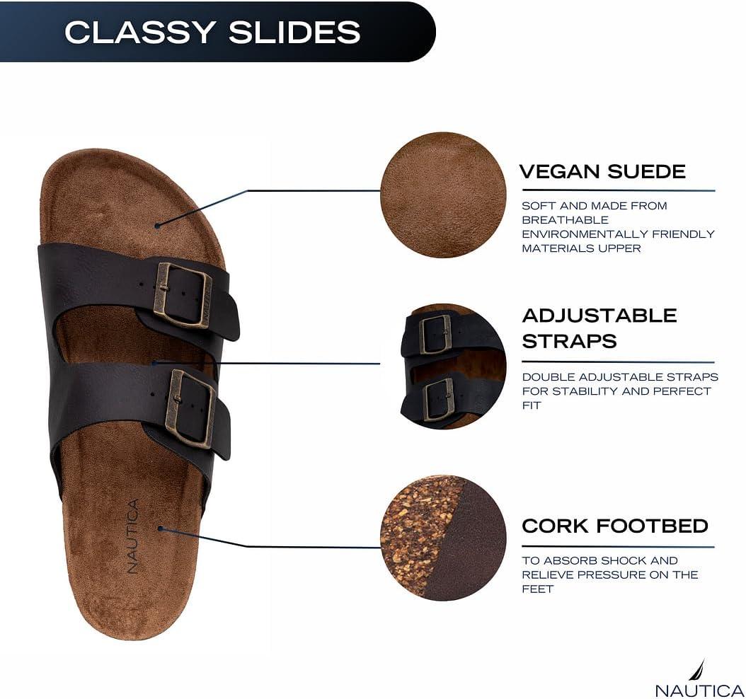 Nautica Men's EVA Double Buckle Slide Sandals Adjustable Waterproof Slip-On Comfort Shoes for Casual Wear Beach and Poolside Experience all-day comfort with the Nautica Men's EVA Double Buckle Slide Sandals designed for effortless wear and superior versatility. These slip-on sandals feature a lightweight EVA construction that delivers a cushioned feel with every step while the adjustable dual-buckle design provides a customizable fit for maximum support. Whether you're heading to the beach, lounging by the pool, or running quick errands these slides offer a seamless combination of style and functionality ensuring a relaxed and modern look for any occasion. Crafted for durability and water resistance these sandals are perfect for both wet and dry conditions making them an ideal choice for vacations outdoor adventures or everyday casual wear. The ergonomic footbed supports natural movement while the textured outsole enhances traction for slip resistance on various surfaces. The flexible construction allows for easy packing and travel making them a must-have essential for summer activities and leisure outings. Upgrade your warm-weather footwear with a sandal that blends fashion comfort and practicality for effortless styling. Designed with a classic open-toe structure and a secure fit these slides provide breathability and long-lasting wear for a range of activities. Whether worn with swim trunks joggers or casual shorts these Nautica slides offer a go-to option for a laid-back lifestyle bringing together premium materials and timeless design for everyday wear.