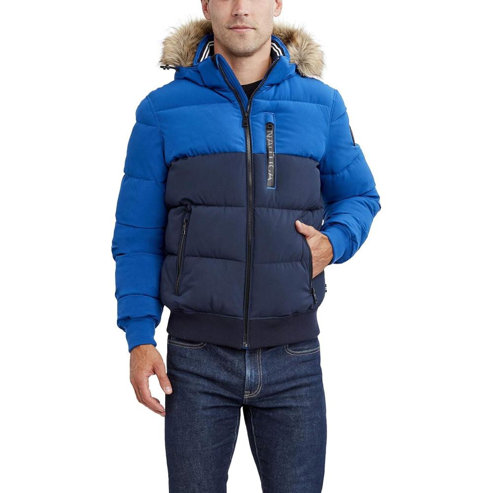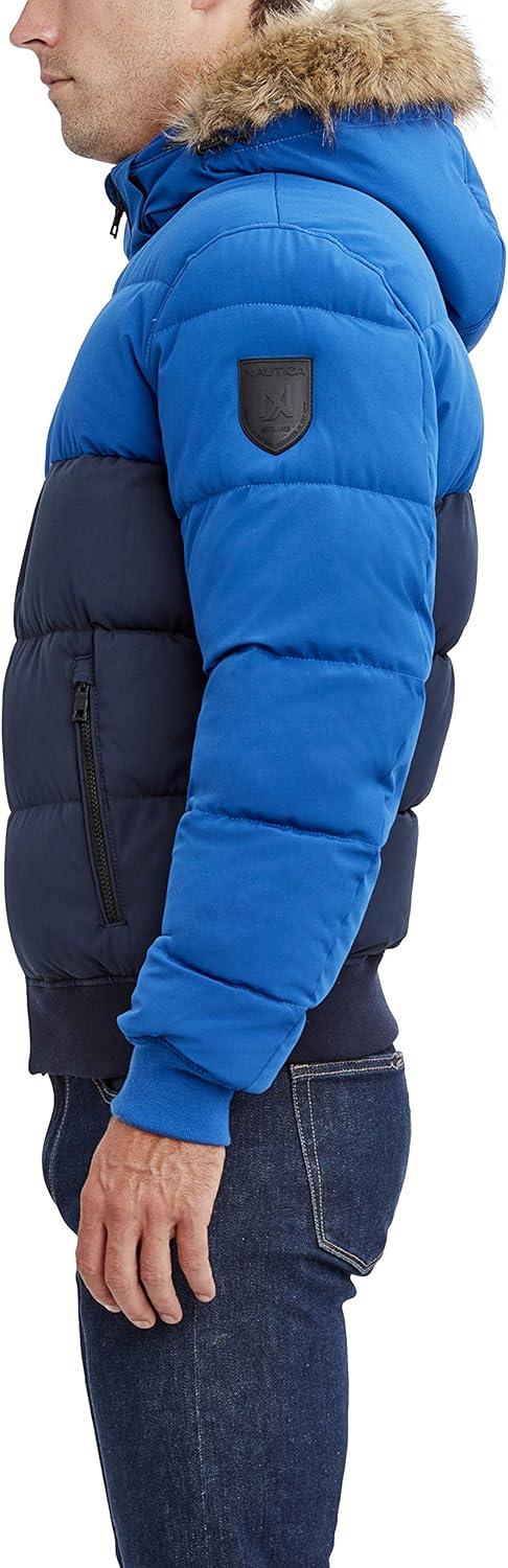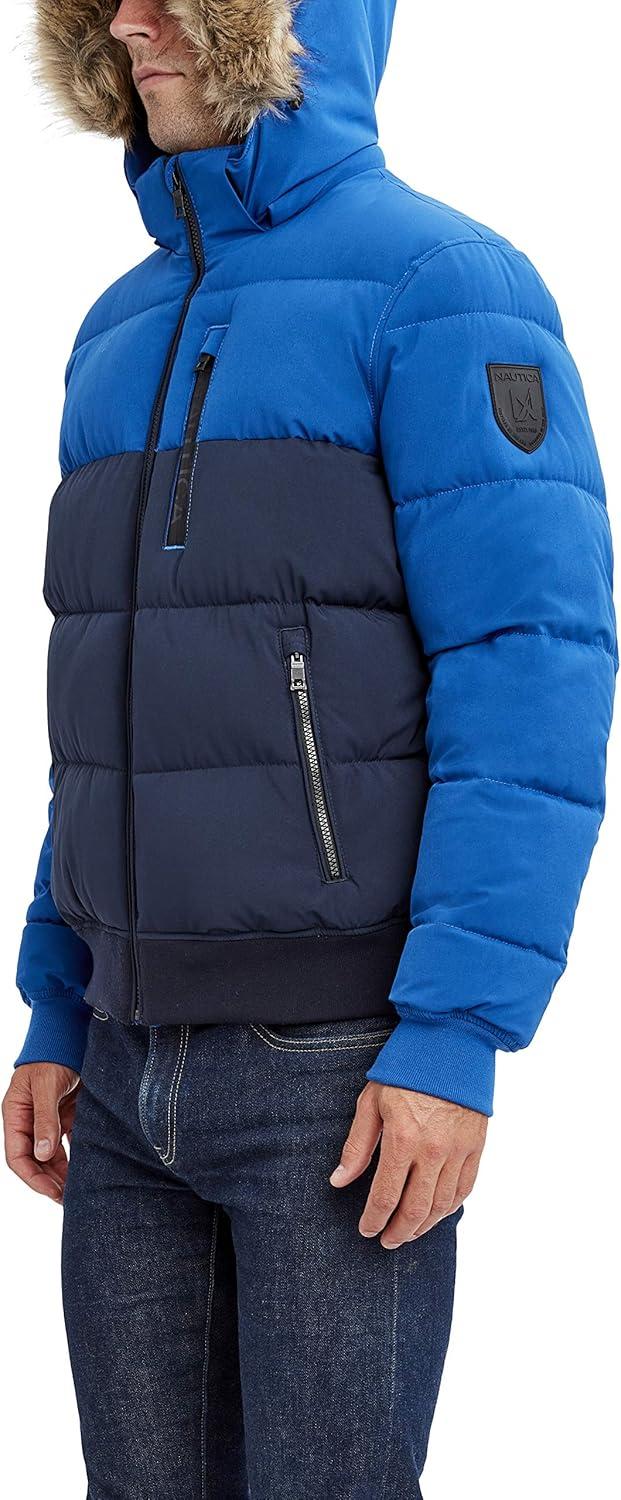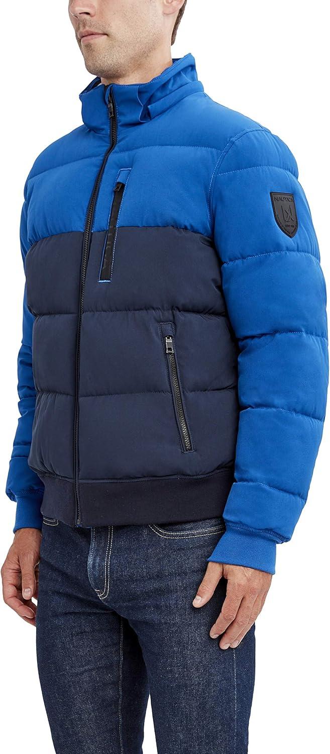 Nautica Men's Midweight Faux Memory Puffer Jacket –Adjustable Hood Insulated Quilted Winter Coat(Blu/Nvy)