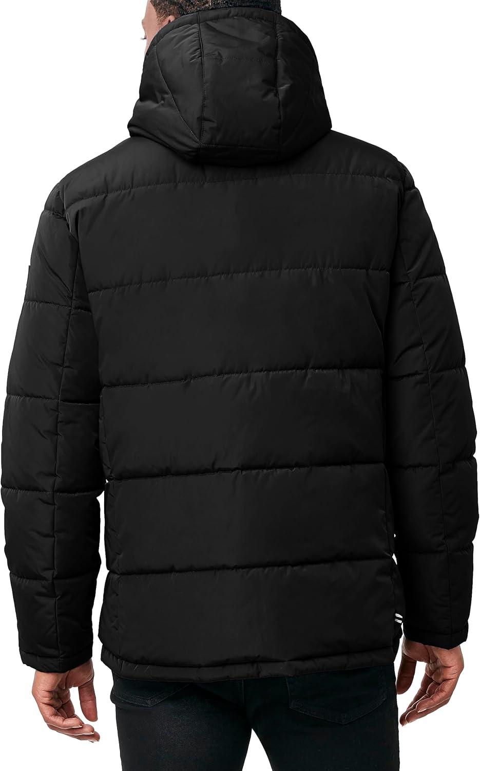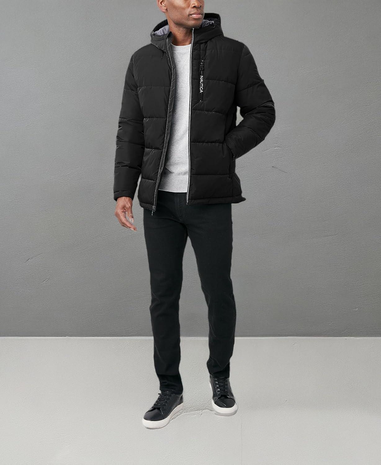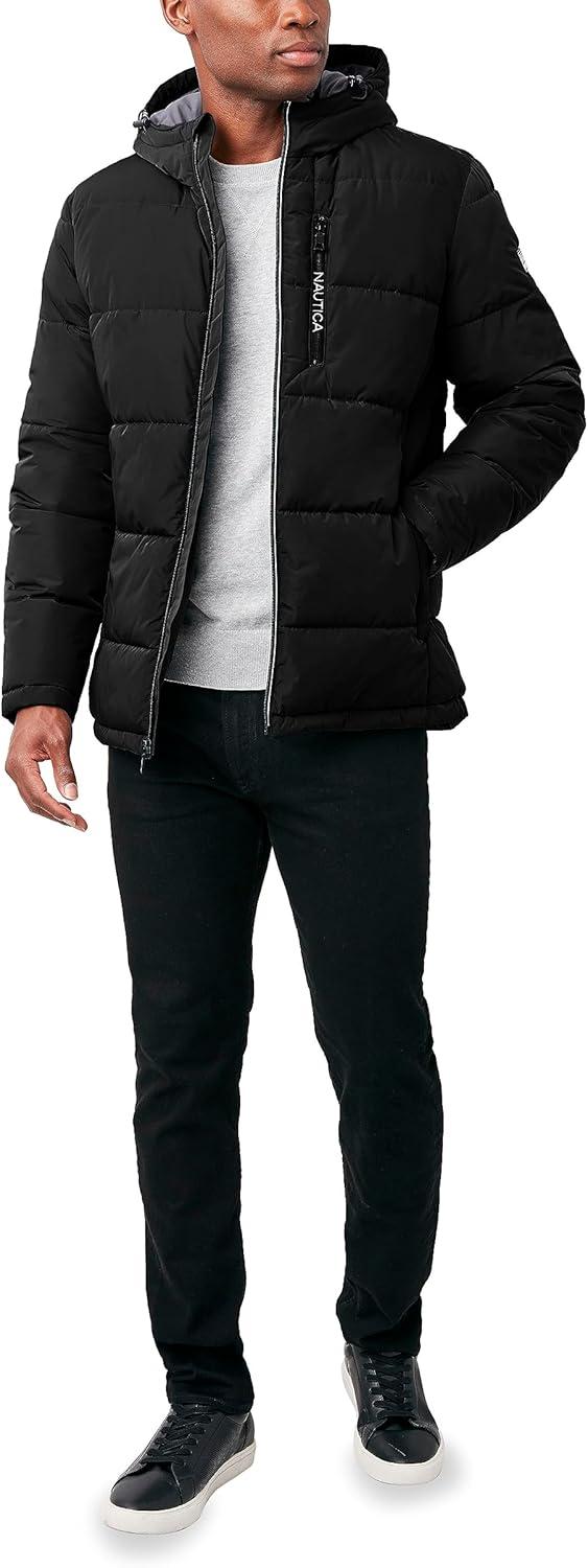 Nautica Men's Midweight Quilted Faux Memory Puffer Jacket –Adjustable Hood Insulated Winter Coat(Black)
