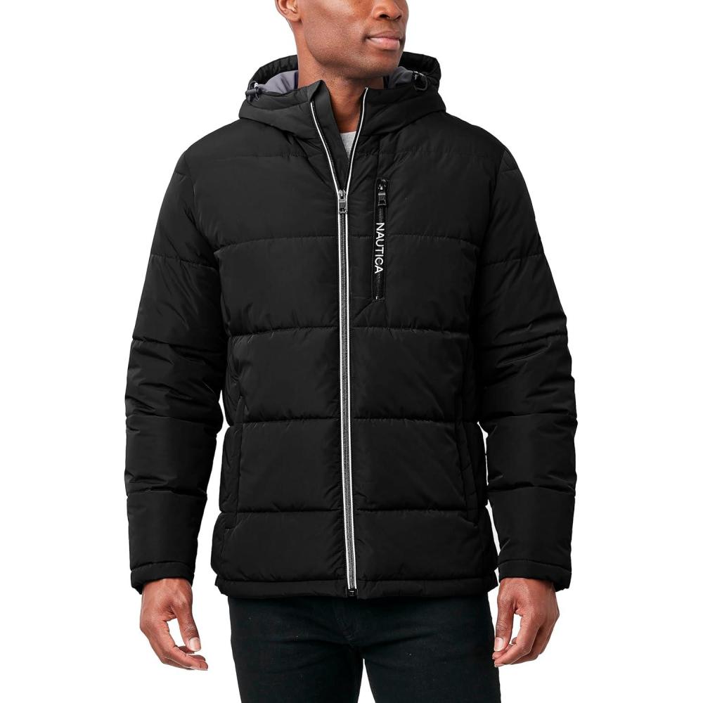 imageNautica Mens Midweight Quilted Faux Memory Puffer Jacket Adjustable Hood Insulated Winter CoatBlack