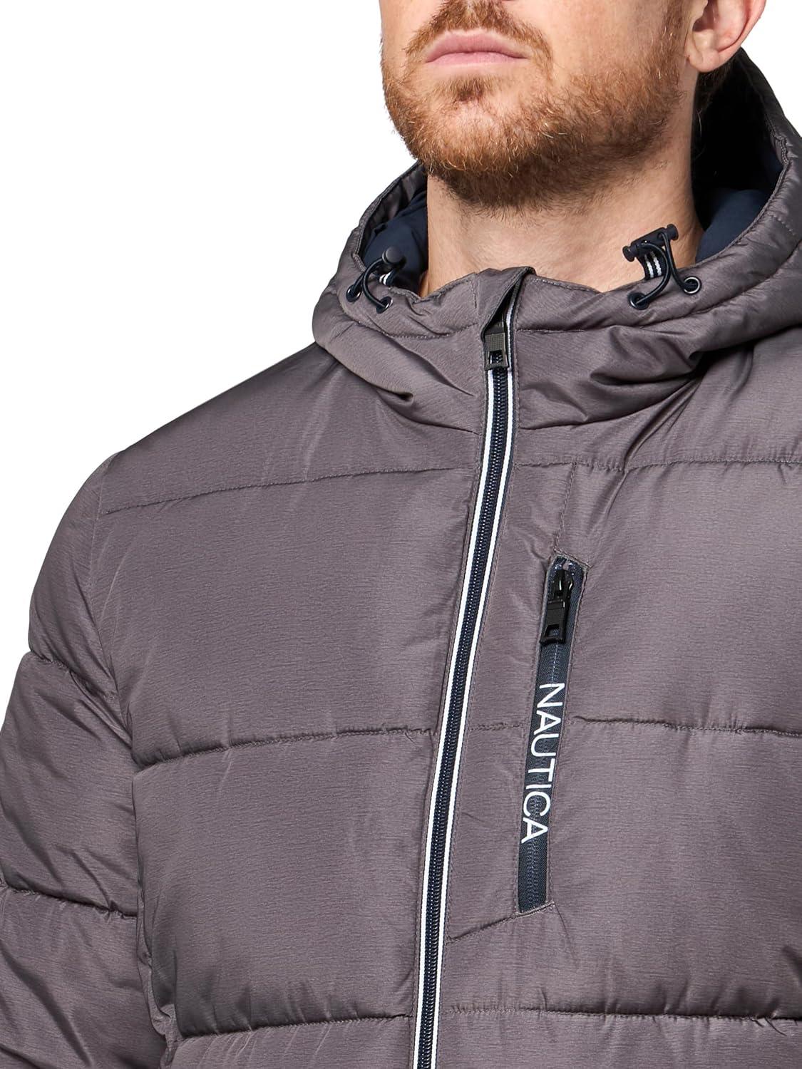 Nautica Men's Midweight Quilted Faux Memory Puffer Jacket –Adjustable Hood Insulated Winter Coat(Heather Grey)
