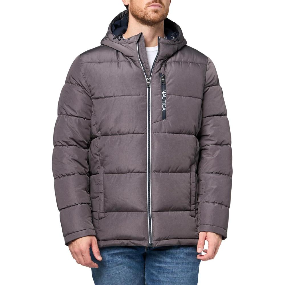 imageNautica Mens Midweight Quilted Faux Memory Puffer Jacket Adjustable Hood Insulated Winter CoatHeather Grey
