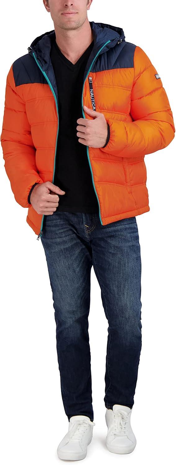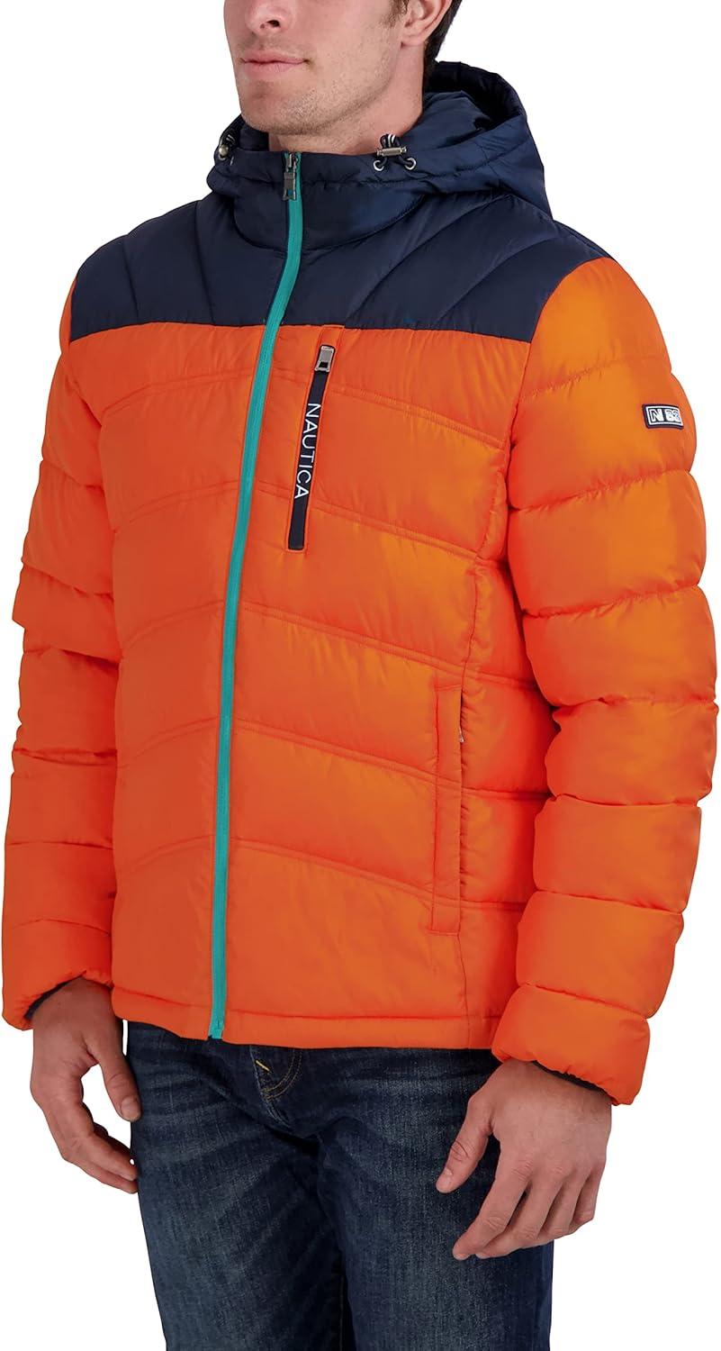 Nautica Men's Midweight Quilted Faux Memory Puffer Jacket –Adjustable Hood Insulated Winter Coat(Orange)