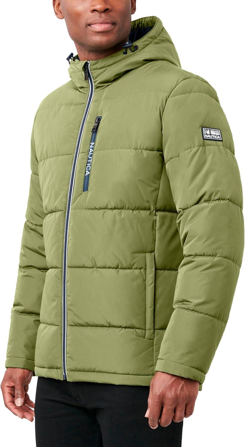 Nautica Men's Midweight Quilted Faux Memory Puffer Jacket –Adjustable Hood Insulated Winter Coat(Pale Olive)