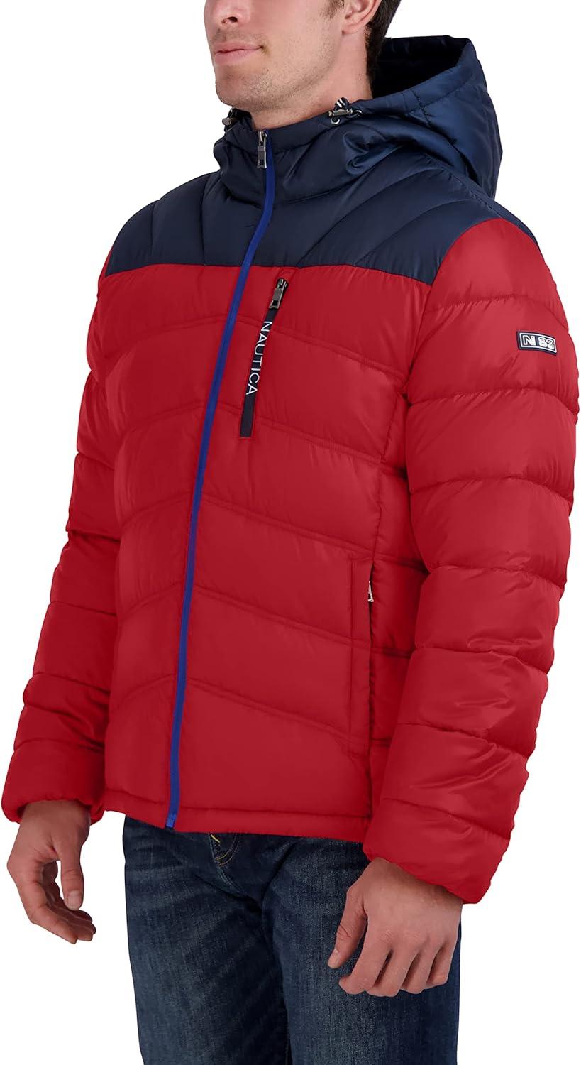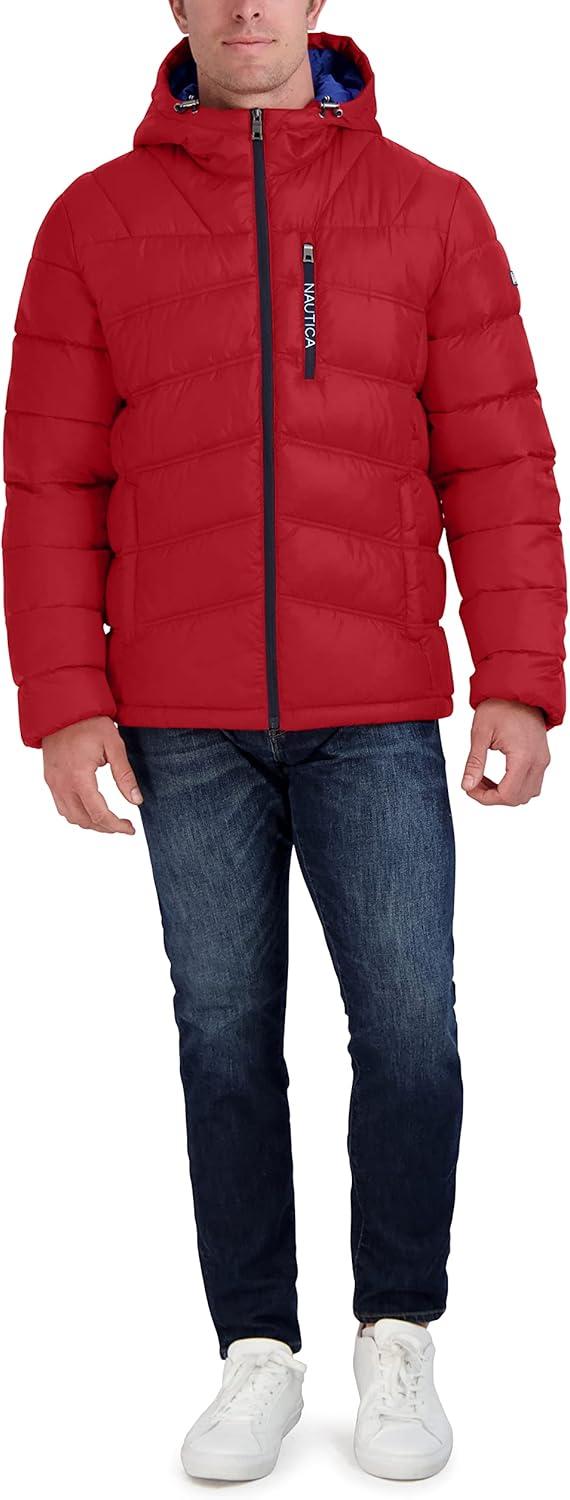 Nautica Men's Midweight Quilted Faux Memory Puffer Jacket –Adjustable Hood Insulated Winter Coat(Red)