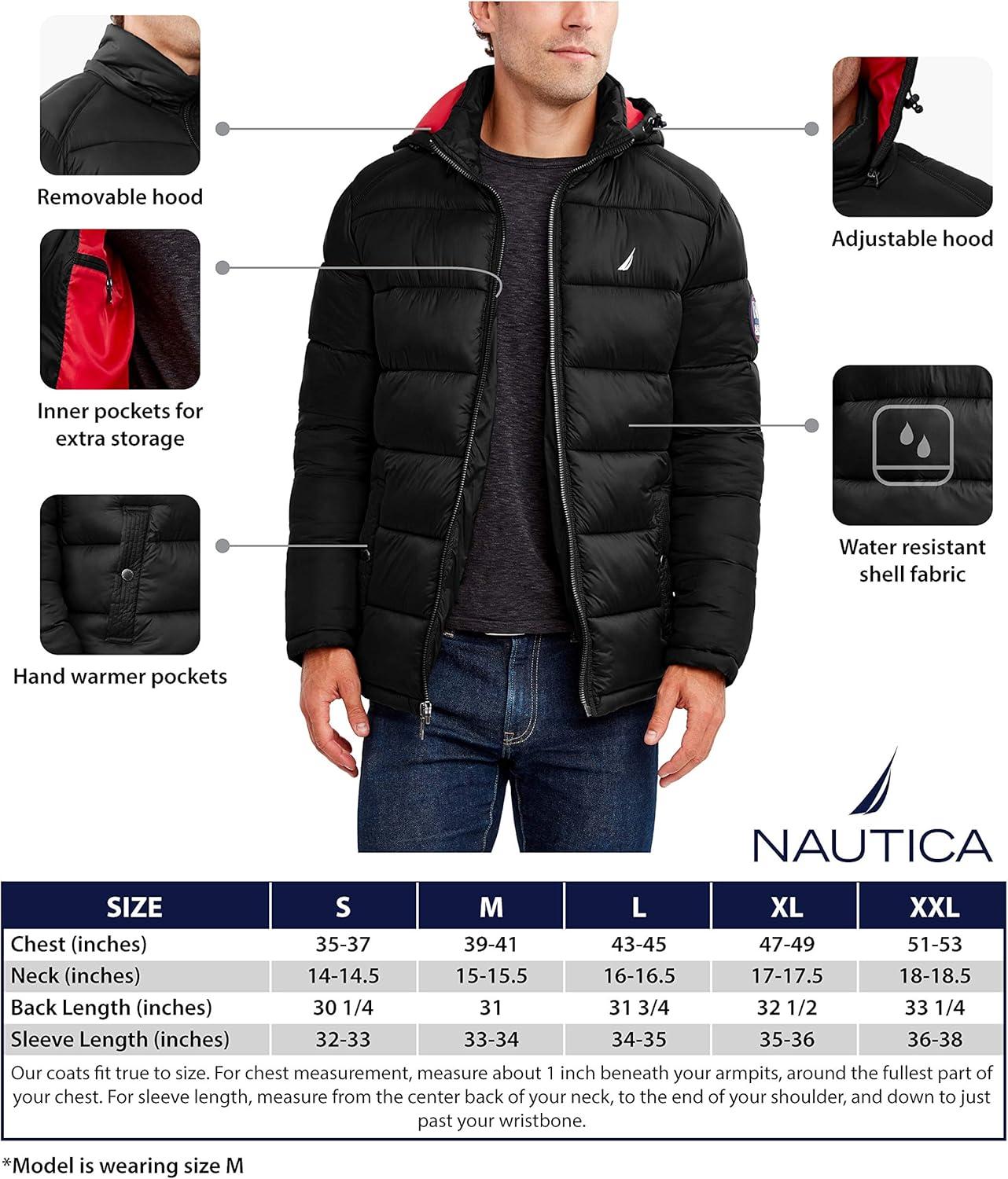 Nautica Men’s Midweight Quilted Faux Memory Puffer Jacket –Adjustable Hood Insulated Winter Coat(Rednavy)
