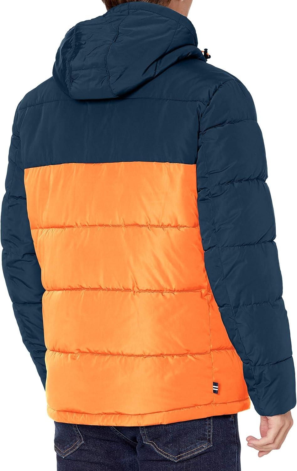 Nautica Men’s Midweight Quilted Faux Memory Puffer Jacket –Adjustable Hood Insulated Winter Coat(Sunset)