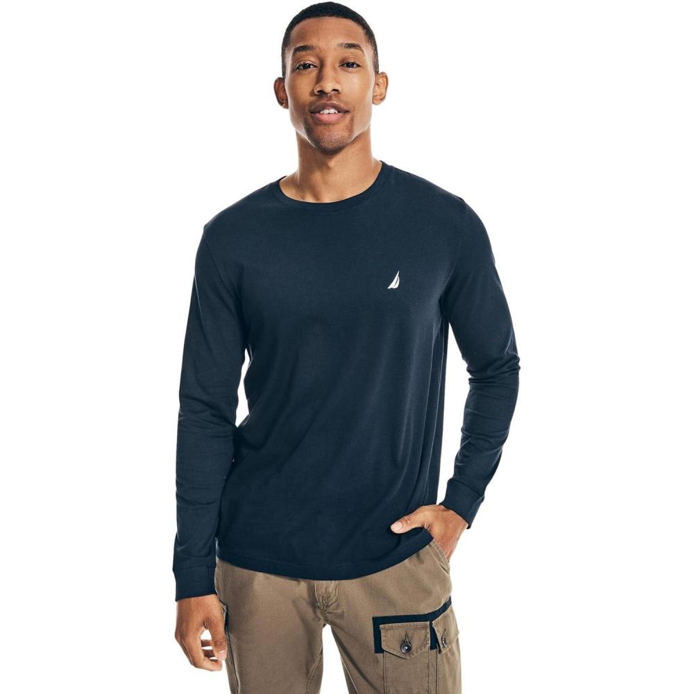 Be cool while staying warm in this soft cotton-jersey long sleeve t-shirt, featuring a ribbed collar and Nautica's signature J-class logo.