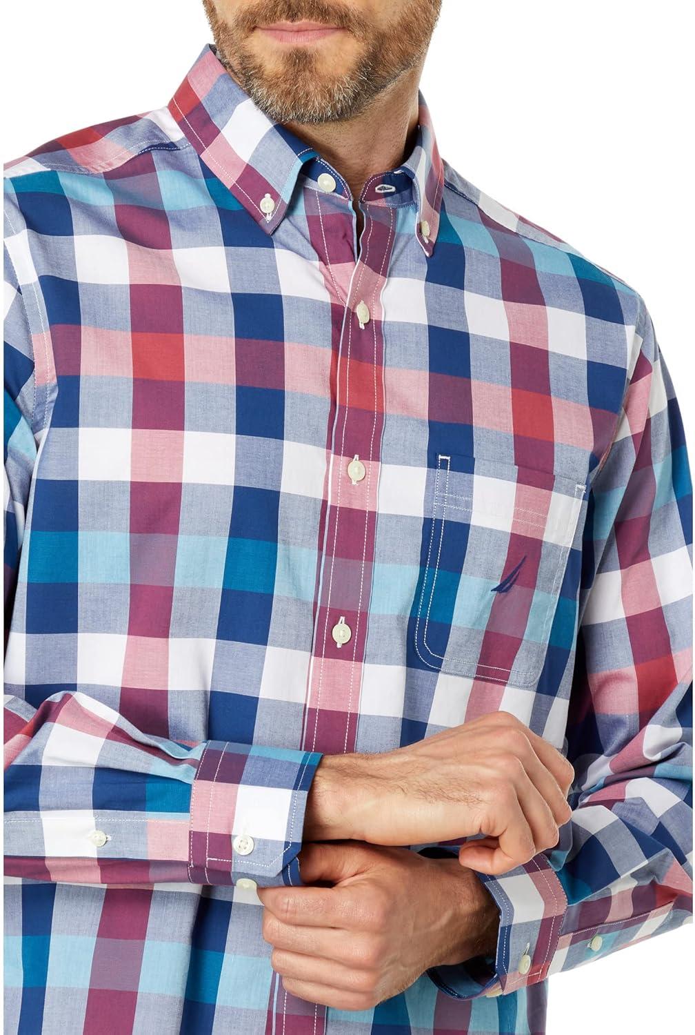 Nautica Regular Fit Long Sleeve Button Down Dress Shirts for Men – Wrinkle Free Long Sleeve Shirt Mens Formal 4-Way Stretch(Blue and Red Check)