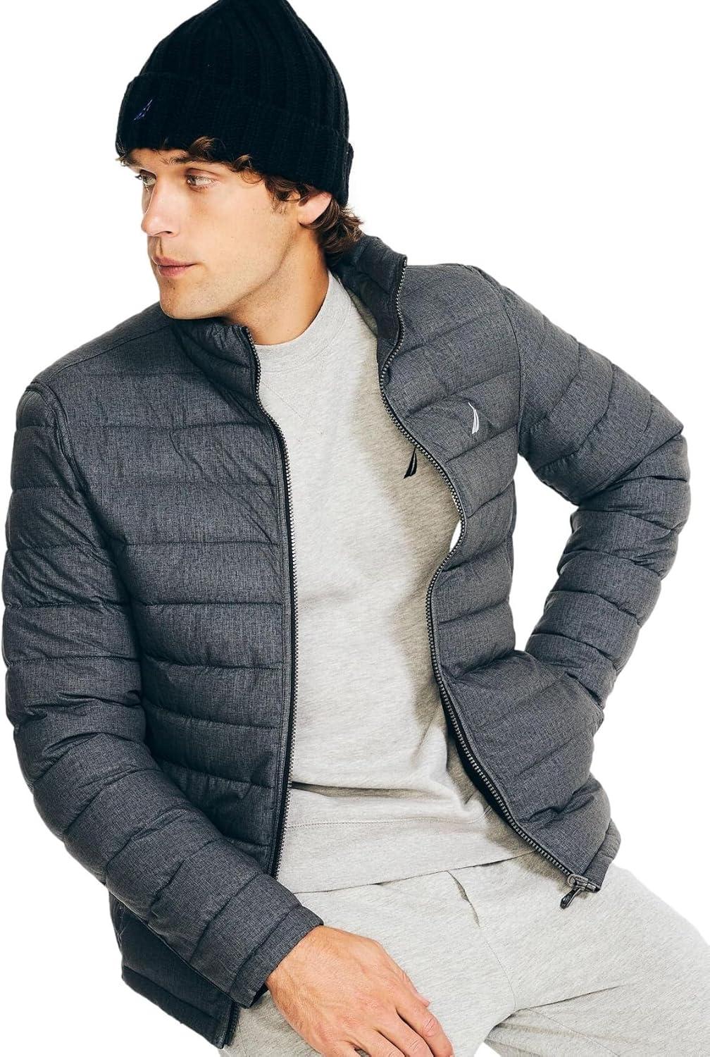 Nautica Men's Reversible Quilted Puffer Jacket –Midweight Mechanical Stretch Winter Coat(Grey / Black X White.)