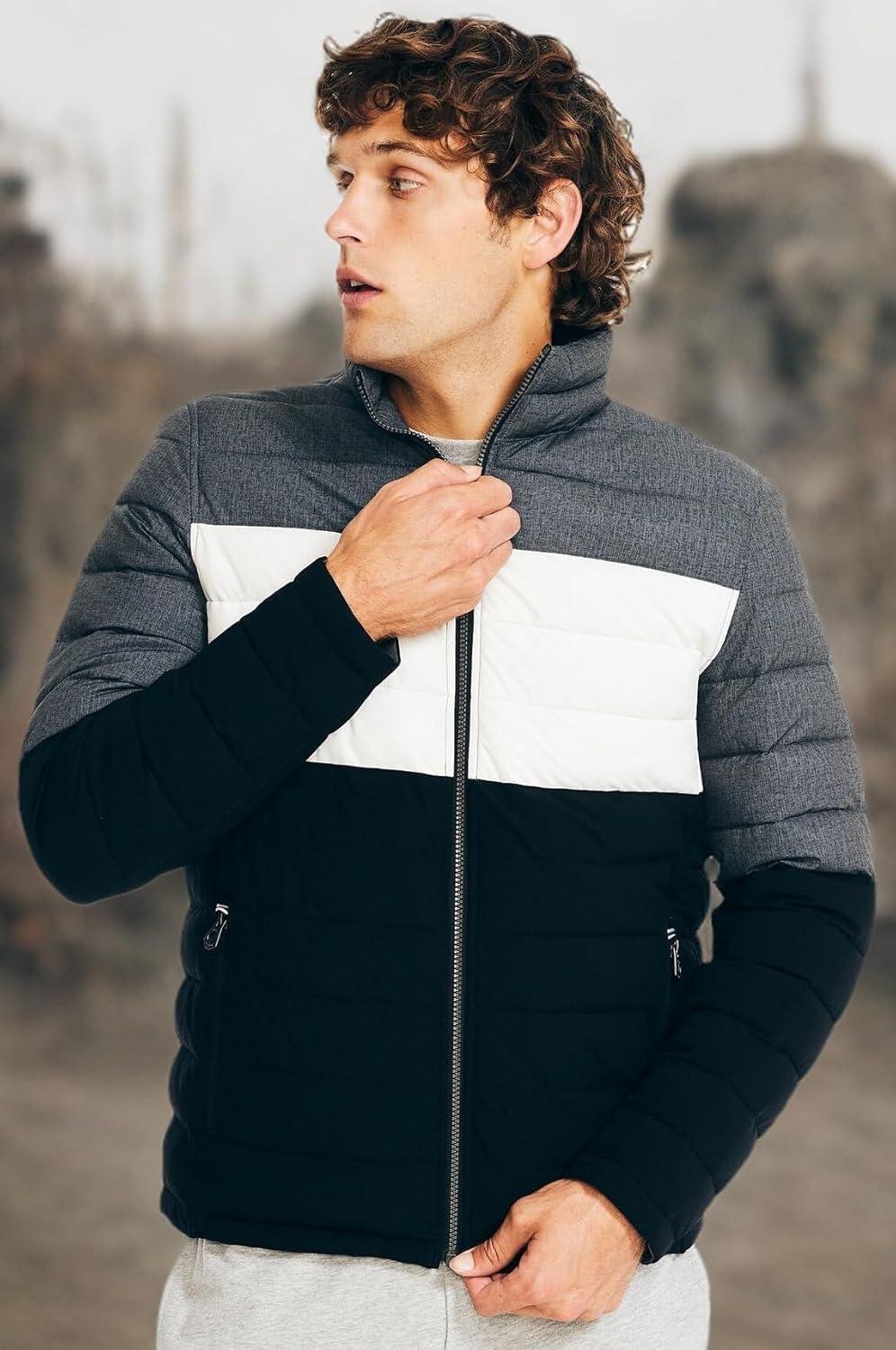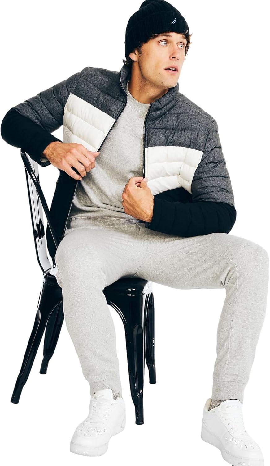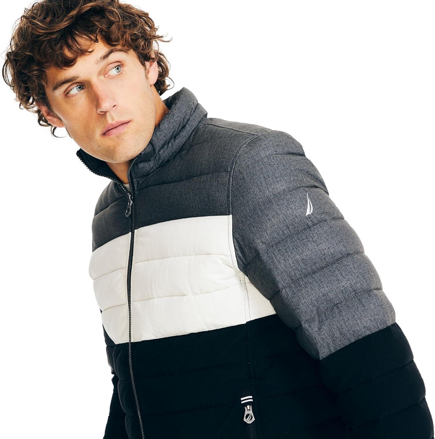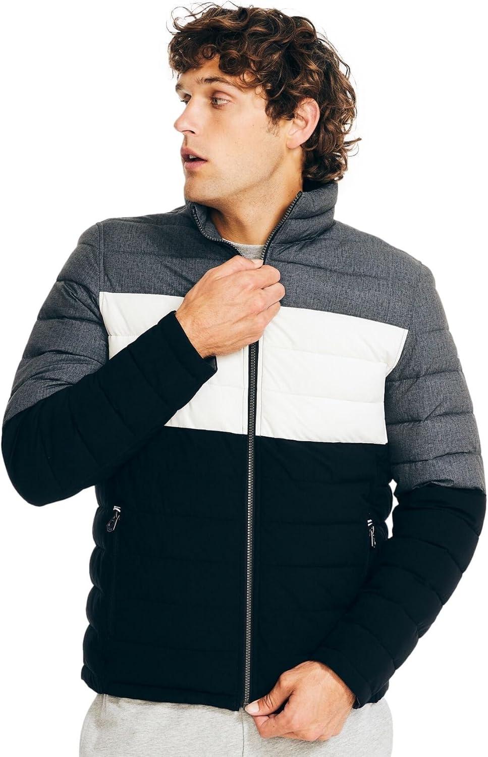 Nautica Men’s Reversible Quilted Puffer Jacket –Midweight Mechanical Stretch Winter Coat(Grey / Black X White.)