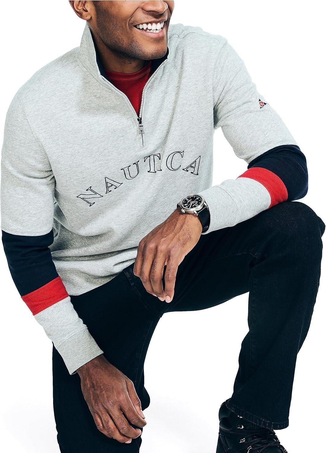 This warm colorblock quarter-zip sweatshirt is just what your cool-weather wardrobe needs. Made from fleece-lined Sustainably Crafted cotton-knit, it features a drawstring hood, ribbed details, and Nautica's logo across the chest.