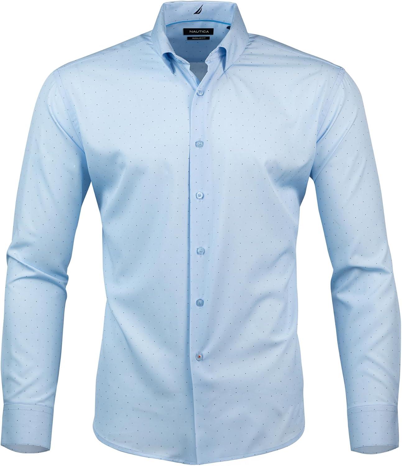 Nautica Regular Fit Long Sleeve Button Down Dress Shirts for Men - Wrinkle Free Long Sleeve Shirt Mens Formal 4-Way Stretch(Navy - Light Blue Dot)