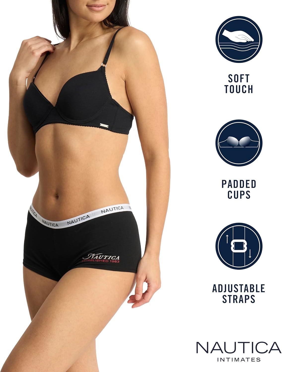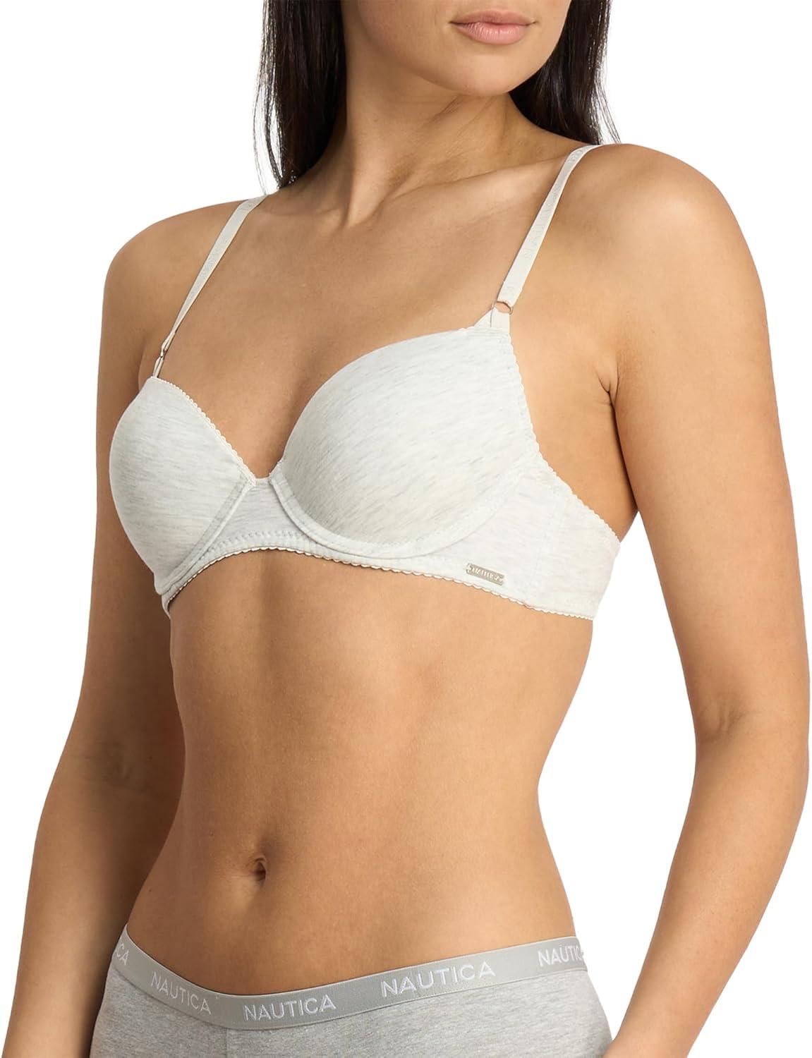 Nautica's 3-Pack T-Shirt Bra sets were designed to disappear under clothing for a smooth, line-free look. Gentle lifting and padding provide shaping and support. Reinforced smoothing fabric next to both cups prevents the dreaded bra bulge. Classic Nautica branding shines on our jacquard shoulder straps and a metal bar charm on the left bottom band. Finished with a pretty picot trim on the cups and band for a feminine touch. Experience the timeless look and quality of Nautica today.