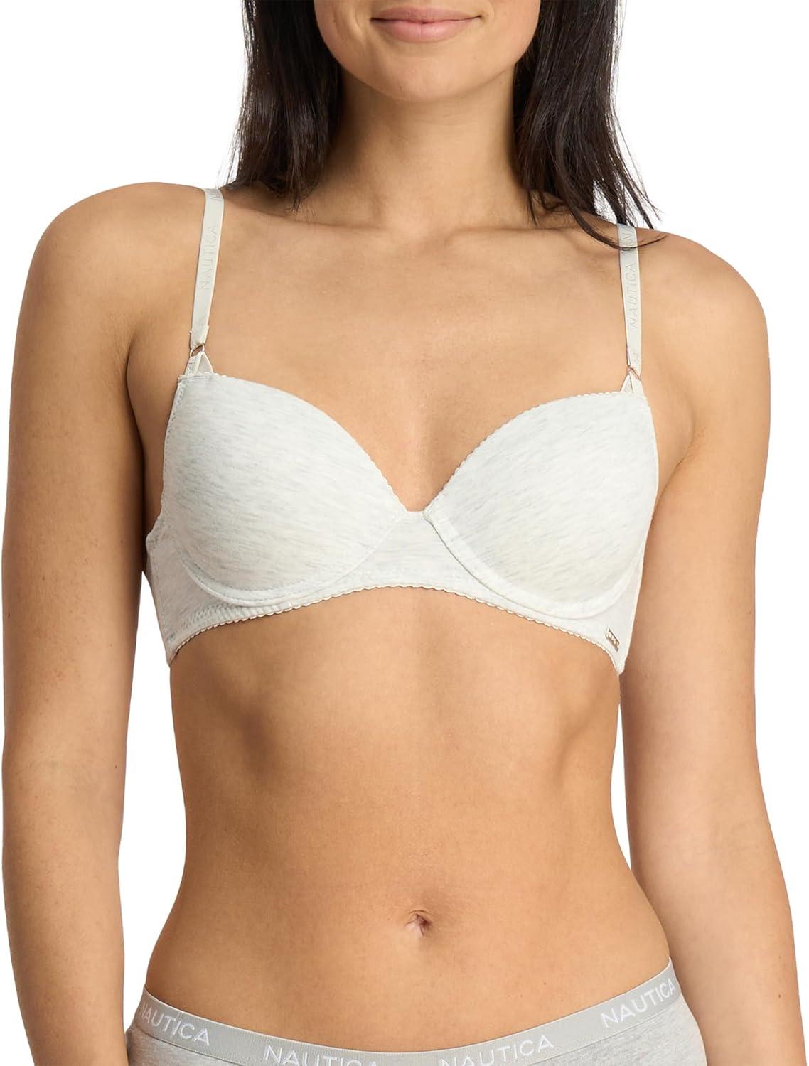 Nautica's 3-Pack T-Shirt Bra sets were designed to disappear under clothing for a smooth, line-free look. Gentle lifting and padding provide shaping and support. Reinforced smoothing fabric next to both cups prevents the dreaded bra bulge. Classic Nautica branding shines on our jacquard shoulder straps and a metal bar charm on the left bottom band. Finished with a pretty picot trim on the cups and band for a feminine touch. Experience the timeless look and quality of Nautica today.