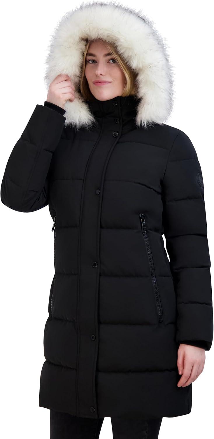Nautica womens Heavyweight Puffer Jacket-faux Fur-lined Hood Wind Water-resistant Winter Coat(Black)