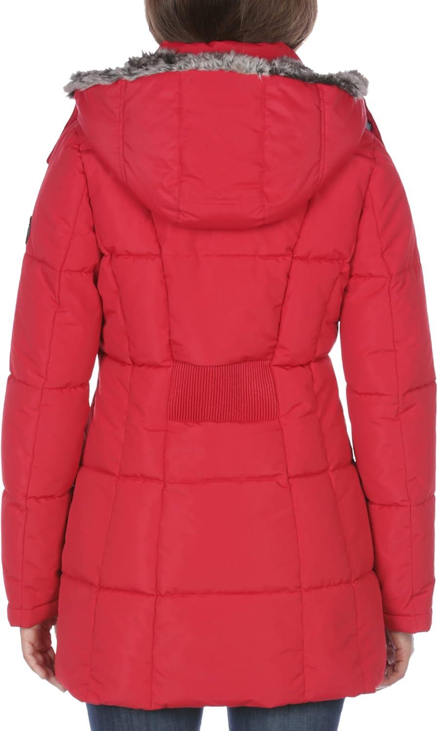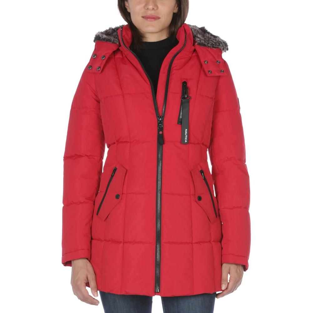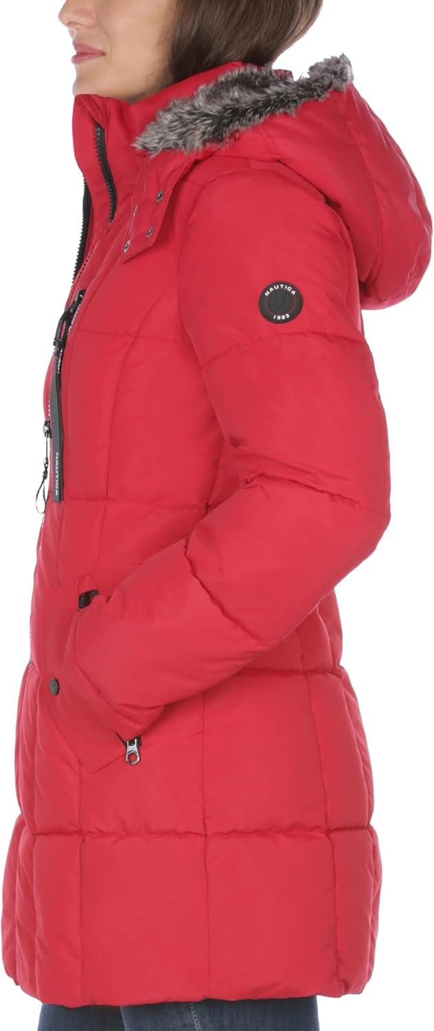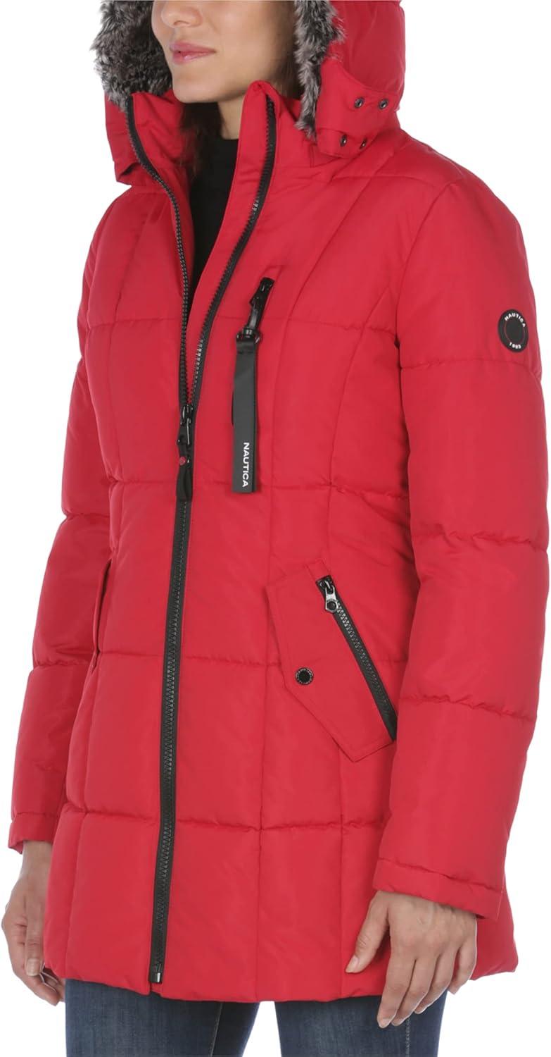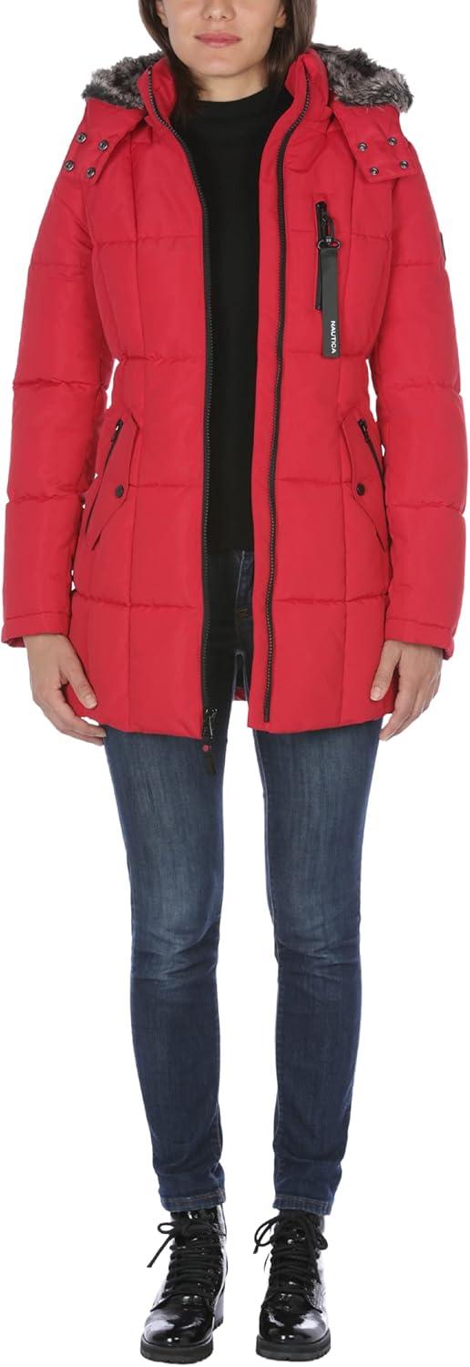 Nautica womens Heavyweight Puffer Jacket With Faux Fur Lined Hood(Deep Red)