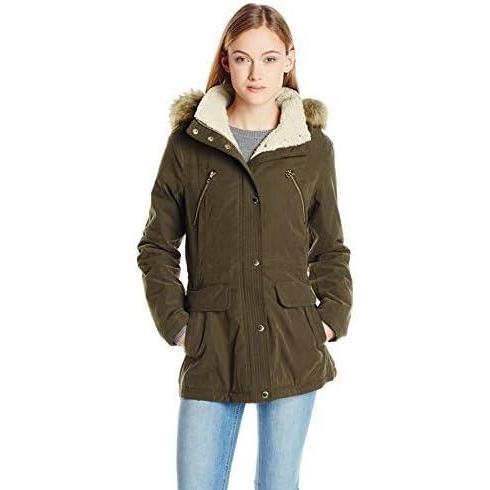 Maxi puffer with faux fur hood strip, button front placket, snap front pockets at waist