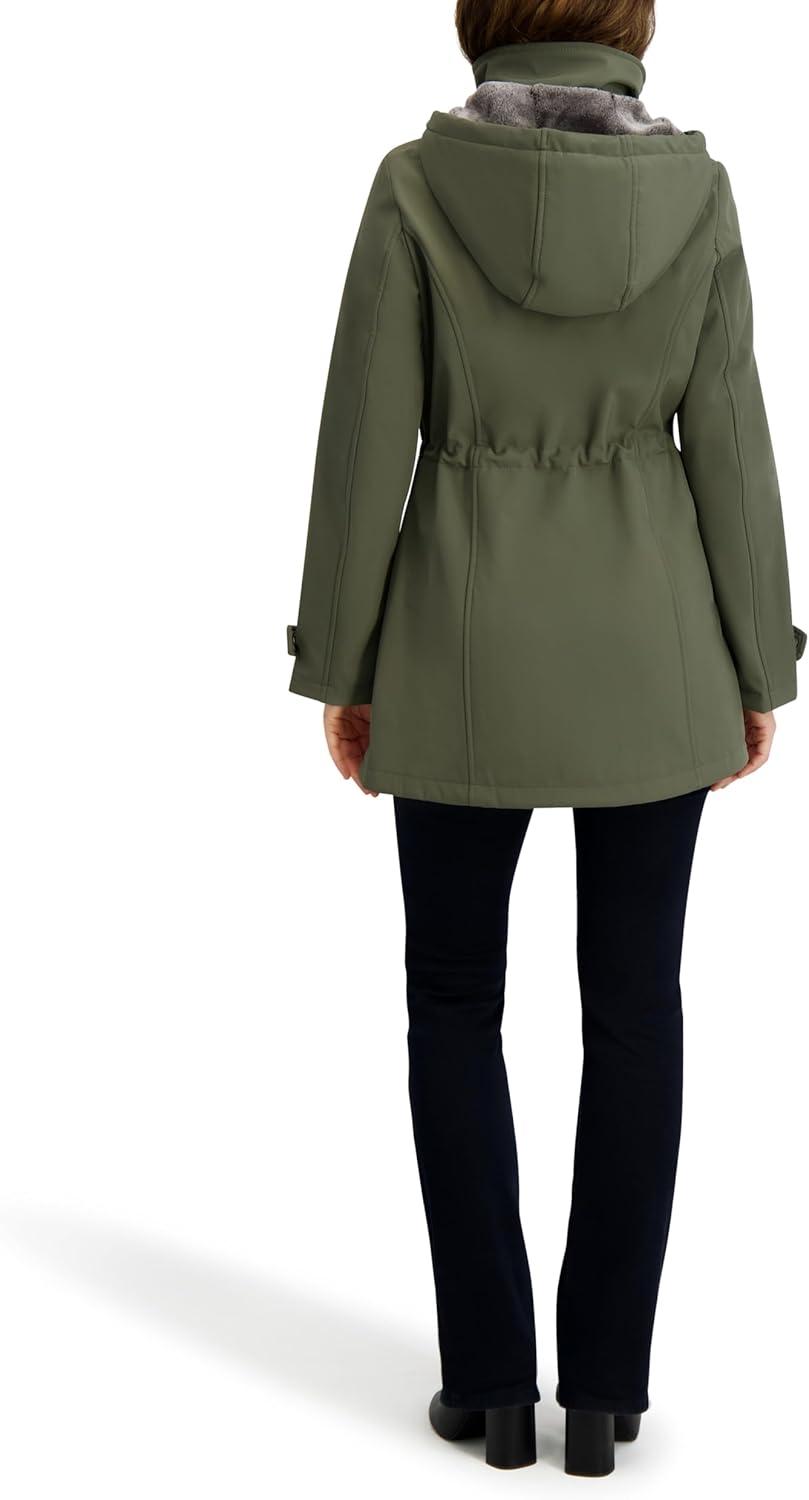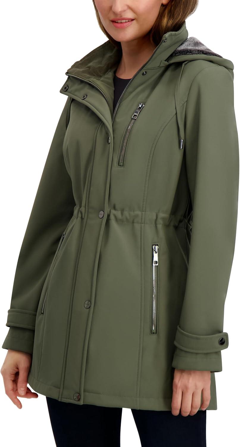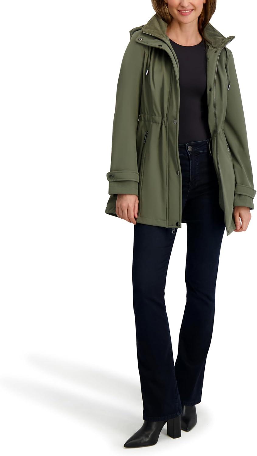 3/4 length soft shell coat with hooded bib, zip front closure
