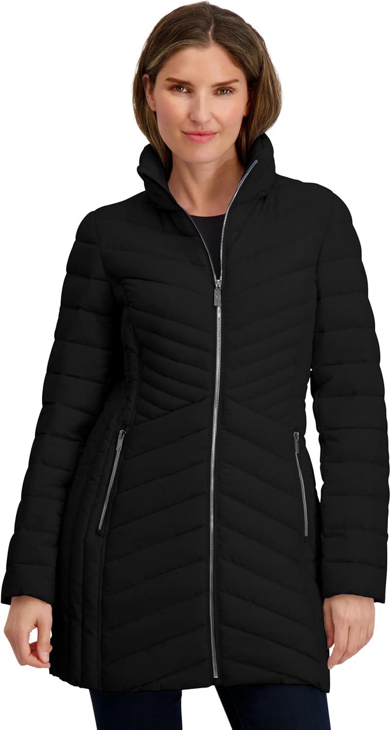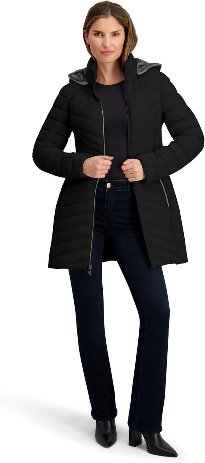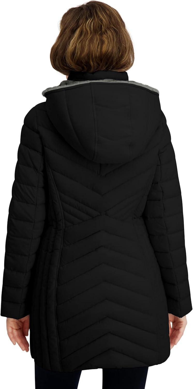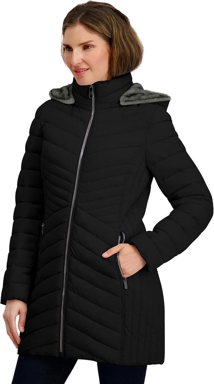 Women's short zip front chevron puffer with removable faux fur trimmed hood